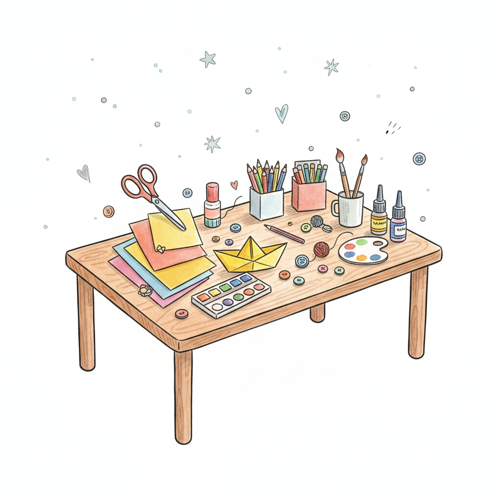 Ein kreativ gestalteter Tisch mit Bastelmaterialien und Farben.
