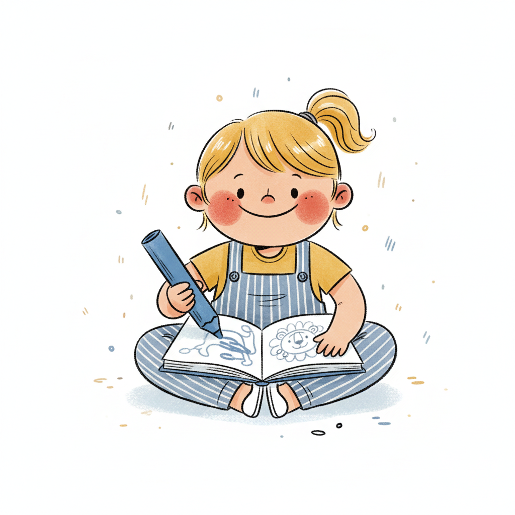 Ein Kind sitzt und malt in einem Buch mit einem großen Buntstift.