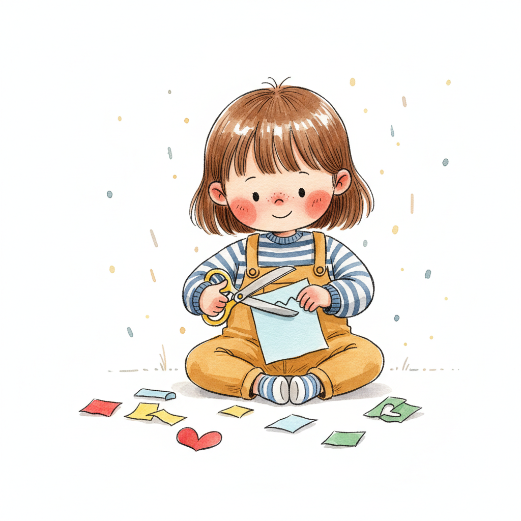 Niedliche, kindgerecht illustrierte Szene mit einem Kind oder einer Person als Hauptfigur, vor rein weißem Hintergrund, im frech-nordischen Aquarell-Skizzenstil. Klare, leicht wackelige Tuschekonturen, sichtbare Pinsel- und Strichtextur, dezente Schraffuren, weiche handgemalte Farbflächen in gedeckten Farben. Einfache, runde Formen. Keine harten Schatten, sondern sanfte, transparente Aquarellschichten. Leicht raue, handgezeichnete Linien statt glatter Vektorkanten. Subtile, vereinzelte Kritzelpunkte oder kleine Details im Hintergrund (wie Pünktchen oder feine Striche), aber keine echte Umgebung oder Landschaft. Die Figur ist mittig zentriert. Insgesamt charmant, humorvoll, warm und handgemacht wirkend. WICHTIG: Das Bild darf ABSOLUT KEINEN TEXT, KEINE BUCHSTABEN und KEINE ZAHLEN enthalten.