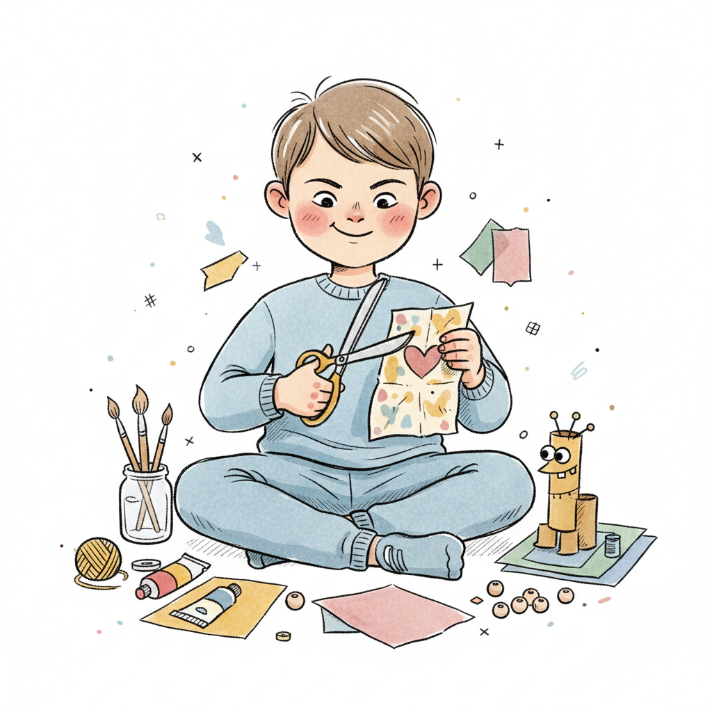 Ein Junge schneidet mit einer Schere Papier und bastelt. Farben und Materialien sind verstreut.
