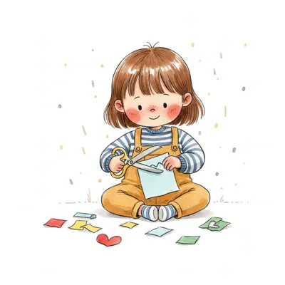 Ein Kind schneidet fröhlich bunte Papiere mit einer Schere.