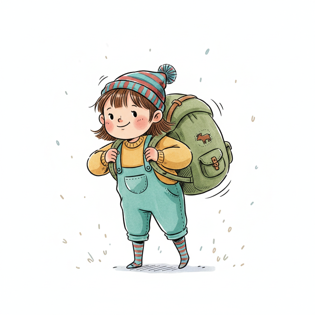 Niedliche, kindgerecht illustrierte Szene mit einem Kind oder einer Person als Hauptfigur, vor rein weißem Hintergrund, im frech-nordischen Aquarell-Skizzenstil. Klare, leicht wackelige Tuschekonturen, sichtbare Pinsel- und Strichtextur, dezente Schraffuren, weiche handgemalte Farbflächen in gedeckten Farben. Einfache, runde Formen. Keine harten Schatten, sondern sanfte, transparente Aquarellschichten. Leicht raue, handgezeichnete Linien statt glatter Vektorkanten. Subtile, vereinzelte Kritzelpunkte oder kleine Details im Hintergrund (wie Pünktchen oder feine Striche), aber keine echte Umgebung oder Landschaft. Die Figur ist mittig zentriert. Insgesamt charmant, humorvoll, warm und handgemacht wirkend. WICHTIG: Das Bild darf ABSOLUT KEINEN TEXT, KEINE BUCHSTABEN und KEINE ZAHLEN enthalten.
