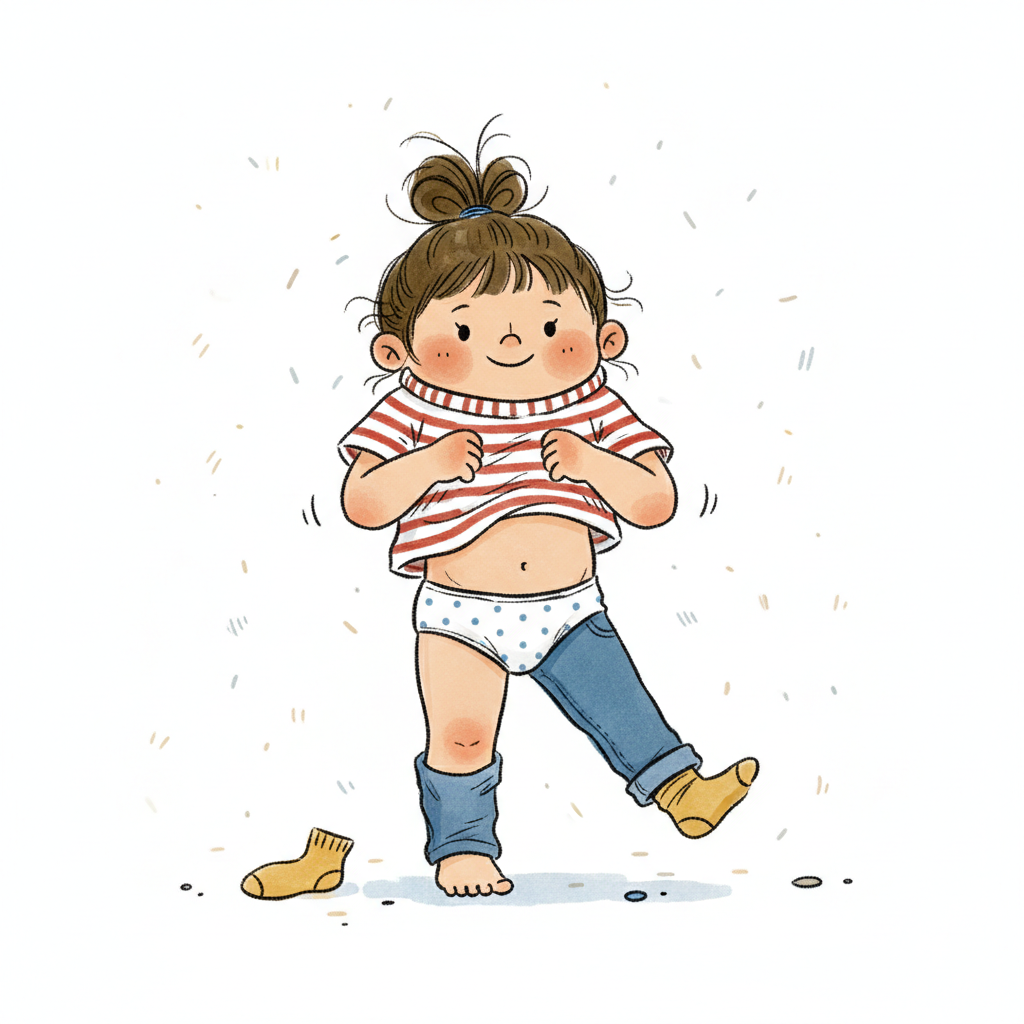 Niedliche, kindgerecht illustrierte Szene mit einem Kind oder einer Person als Hauptfigur, vor rein weißem Hintergrund, im frech-nordischen Aquarell-Skizzenstil. Klare, leicht wackelige Tuschekonturen, sichtbare Pinsel- und Strichtextur, dezente Schraffuren, weiche handgemalte Farbflächen in gedeckten Farben. Einfache, runde Formen. Keine harten Schatten, sondern sanfte, transparente Aquarellschichten. Leicht raue, handgezeichnete Linien statt glatter Vektorkanten. Subtile, vereinzelte Kritzelpunkte oder kleine Details im Hintergrund (wie Pünktchen oder feine Striche), aber keine echte Umgebung oder Landschaft. Die Figur ist mittig zentriert. Insgesamt charmant, humorvoll, warm und handgemacht wirkend. WICHTIG: Das Bild darf ABSOLUT KEINEN TEXT, KEINE BUCHSTABEN und KEINE ZAHLEN enthalten.
