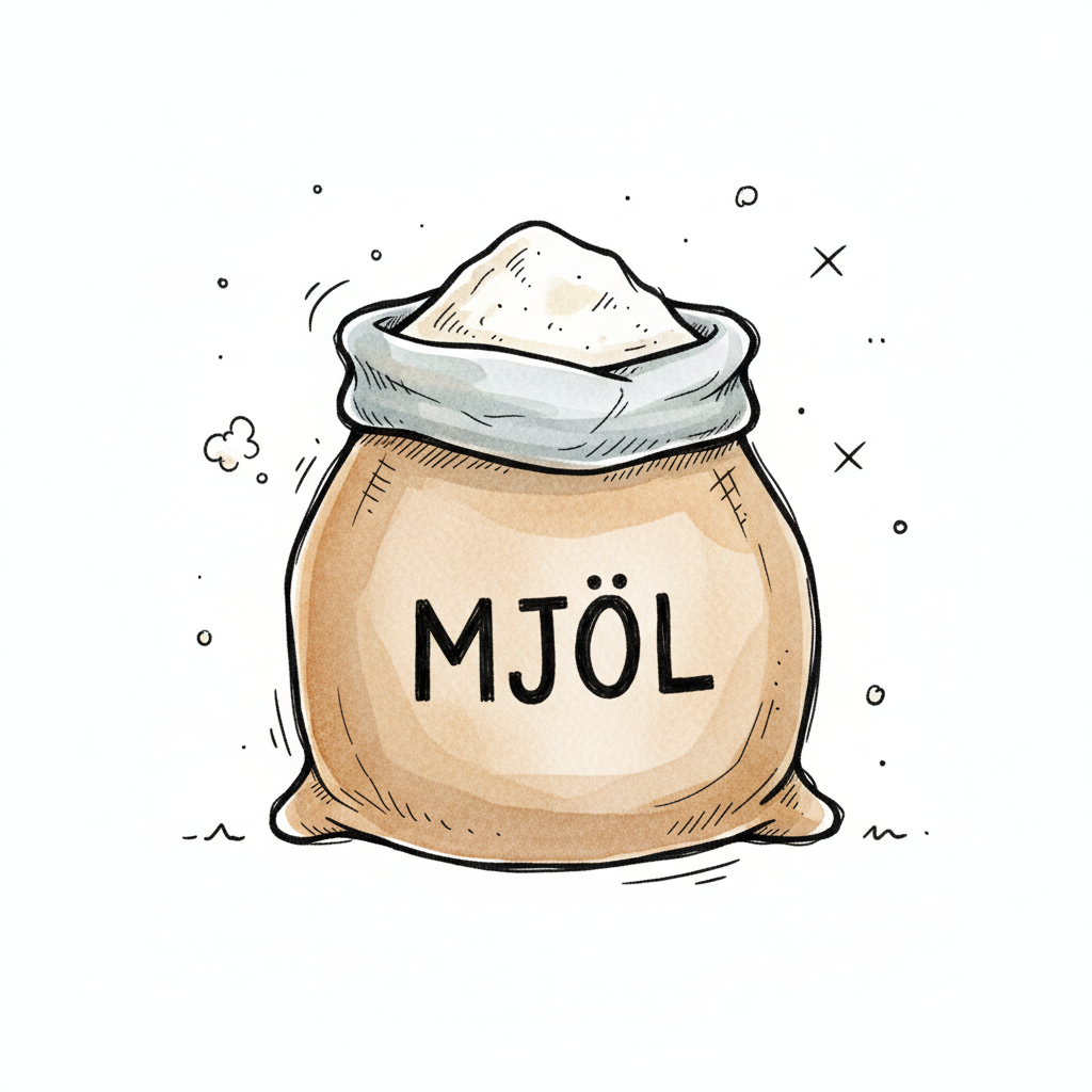 Handgezeichnete Illustration eines Mehlsacks mit der Aufschrift 'MJÖL', gefüllt mit weißem Mehl.