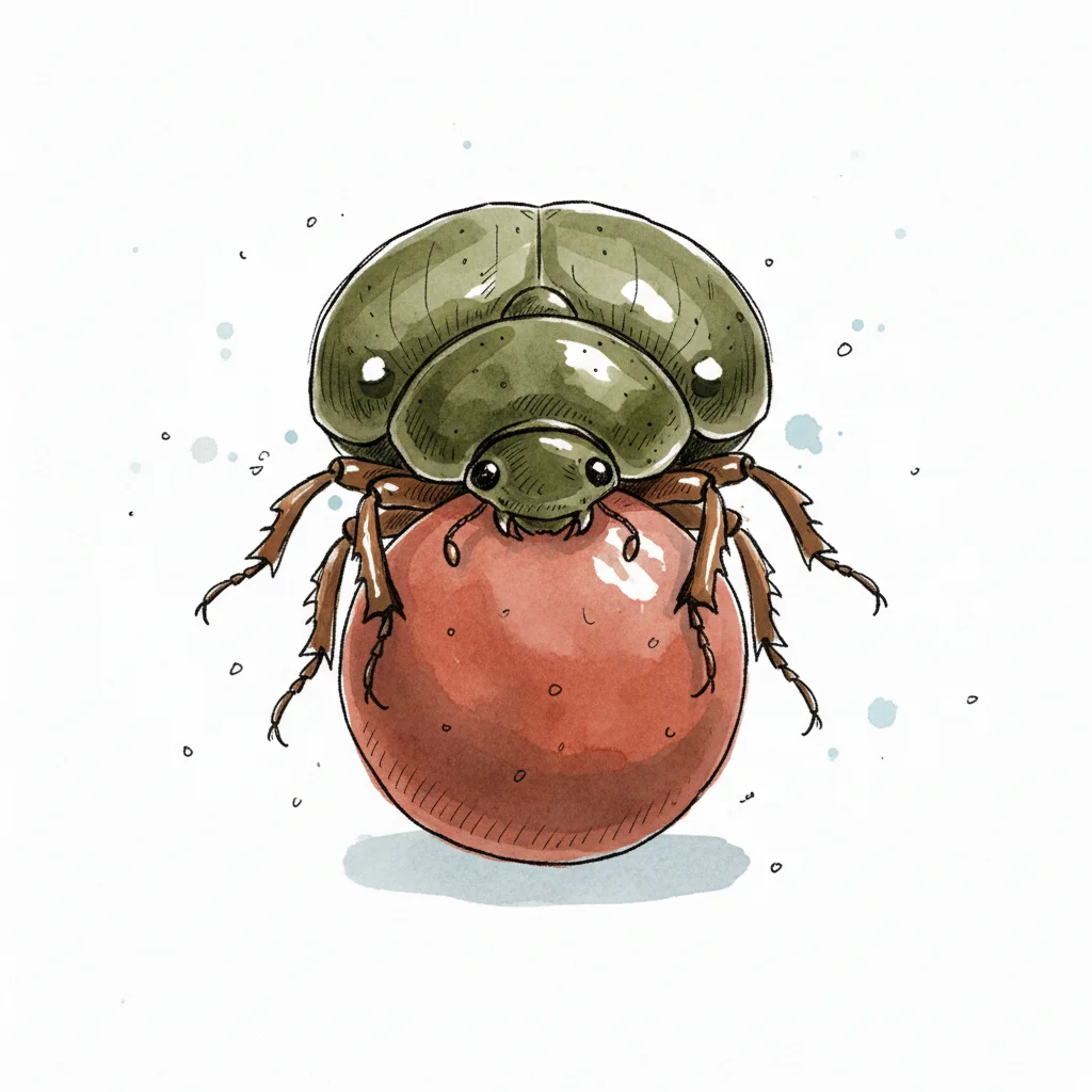 Illustration eines braunen Käfers von oben, mit feinen Details und Aquarell-Stil auf weißem Grund.