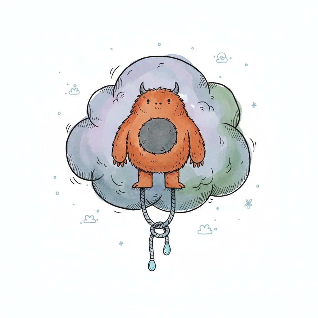 Niedliches, orangefarbenes Monster auf einer Wolke, an der ein Seil mit Wassertropfen hängt.