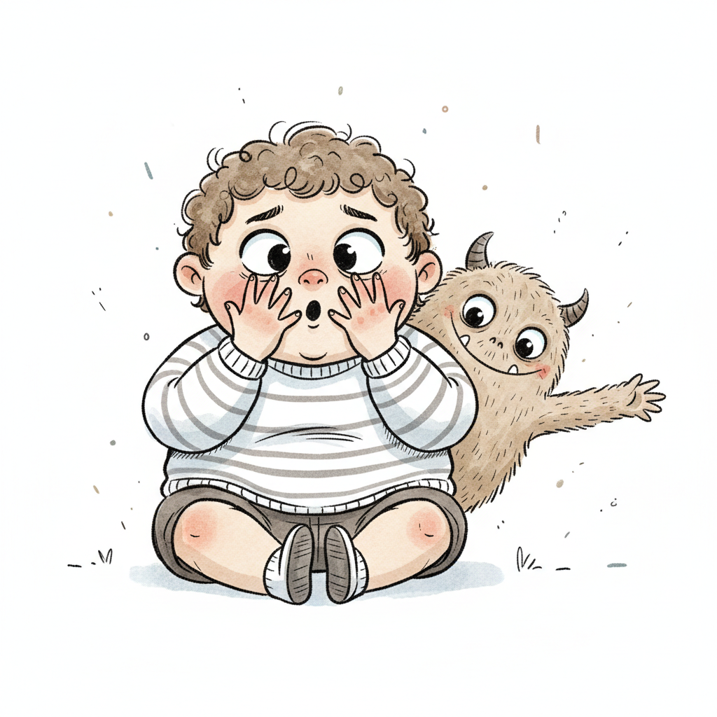Ein verängstigtes Kind wird von einem kleinen, lächelnden Monster überrascht.