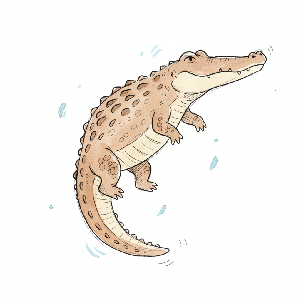 Niedliches, braunes Cartoon-Krokodil schwimmt mit einem Lächeln im Wasser.