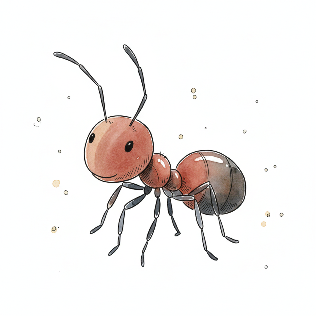 Niedliche, lächelnde Ameise in Cartoon-Stil, gezeichnet mit Aquarellfarben auf weißem Hintergrund.