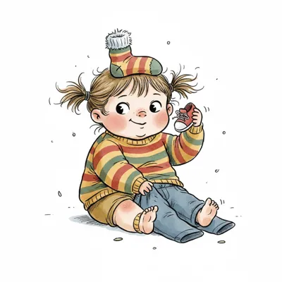 Niedliches Baby mit Socke auf dem Kopf und Schuh in der Hand, sitzt spielerisch mit heruntergelassener Hose.