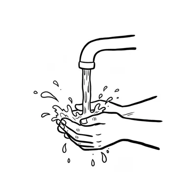 Hände werden unter einem Wasserhahn gewaschen, Wasser spritzt. Schwarz-Weiß-Zeichnung.