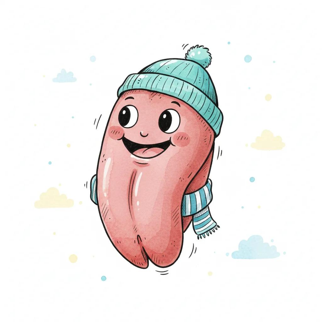 Ein fröhlicher cartoonartiger Charakter mit Mütze und Schal.