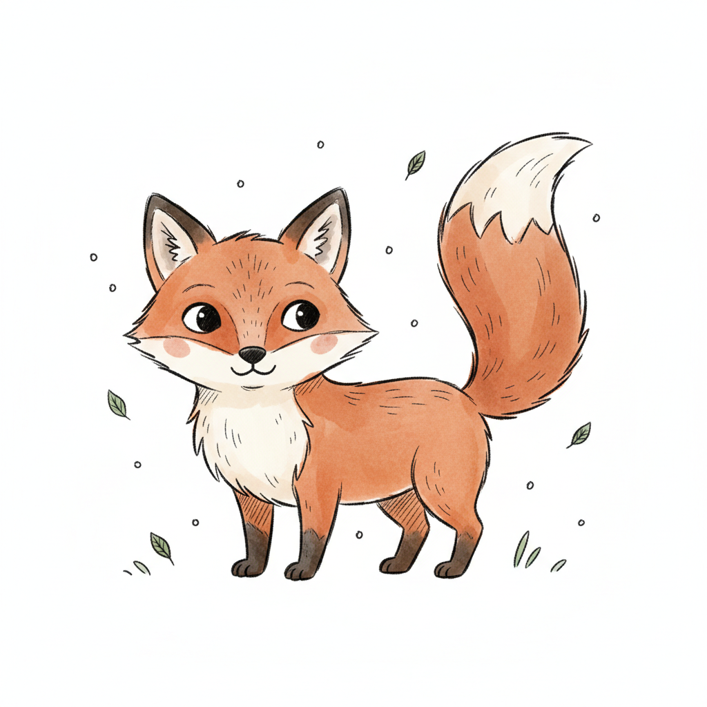 Ein niedlicher, cartoonhafter Fuchs mit einem buschigen Schwanz.
