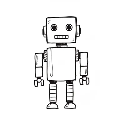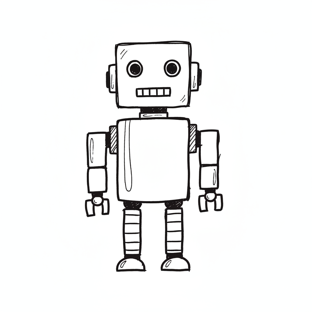 Einfache, schwarz-weiße Strichzeichnung eines Roboters mit quadratischem Kopf und freundlichem Gesicht.