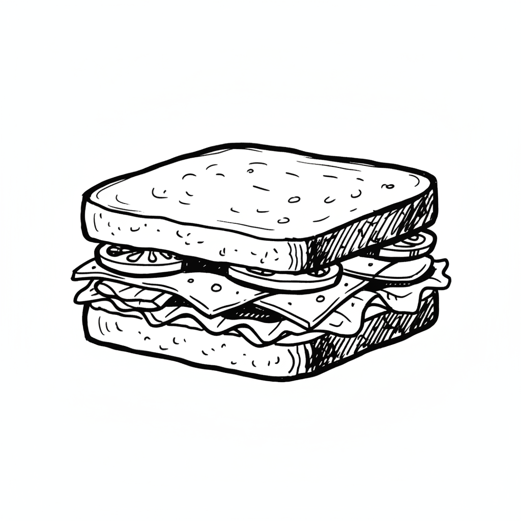 Schwarz-weiße Strichzeichnung eines Sandwiches mit Brot, Salat, Käse und Tomaten.