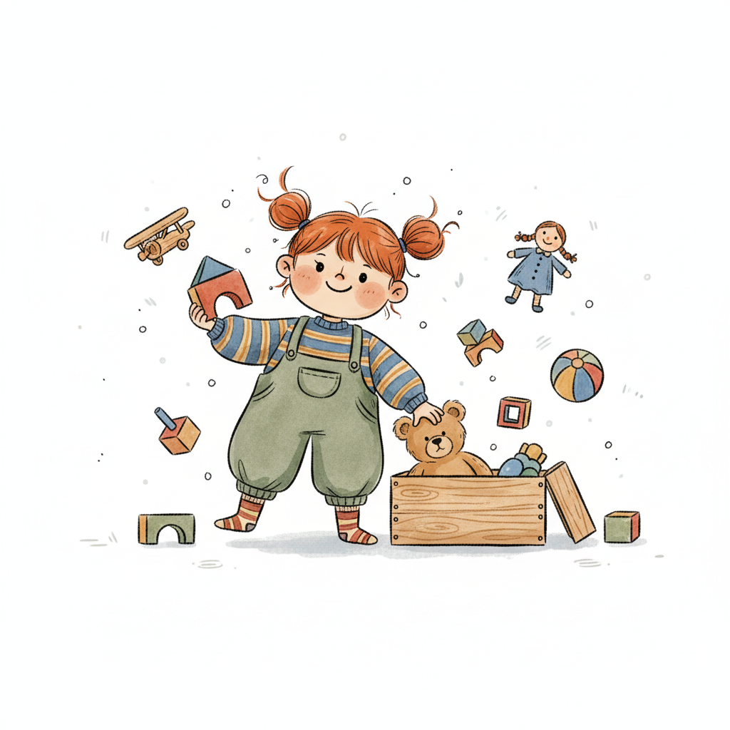 Niedliche, kindgerecht illustrierte Szene mit einem Kind oder einer Person als Hauptfigur, vor rein weißem Hintergrund, im frech-nordischen Aquarell-Skizzenstil. Klare, leicht wackelige Tuschekonturen, sichtbare Pinsel- und Strichtextur, dezente Schraffuren, weiche handgemalte Farbflächen in gedeckten Farben. Einfache, runde Formen. Keine harten Schatten, sondern sanfte, transparente Aquarellschichten. Leicht raue, handgezeichnete Linien statt glatter Vektorkanten. Subtile, vereinzelte Kritzelpunkte oder kleine Details im Hintergrund (wie Pünktchen oder feine Striche), aber keine echte Umgebung oder Landschaft. Die Figur ist mittig zentriert. Insgesamt charmant, humorvoll, warm und handgemacht wirkend. WICHTIG: Das Bild darf ABSOLUT KEINEN TEXT, KEINE BUCHSTABEN und KEINE ZAHLEN enthalten.