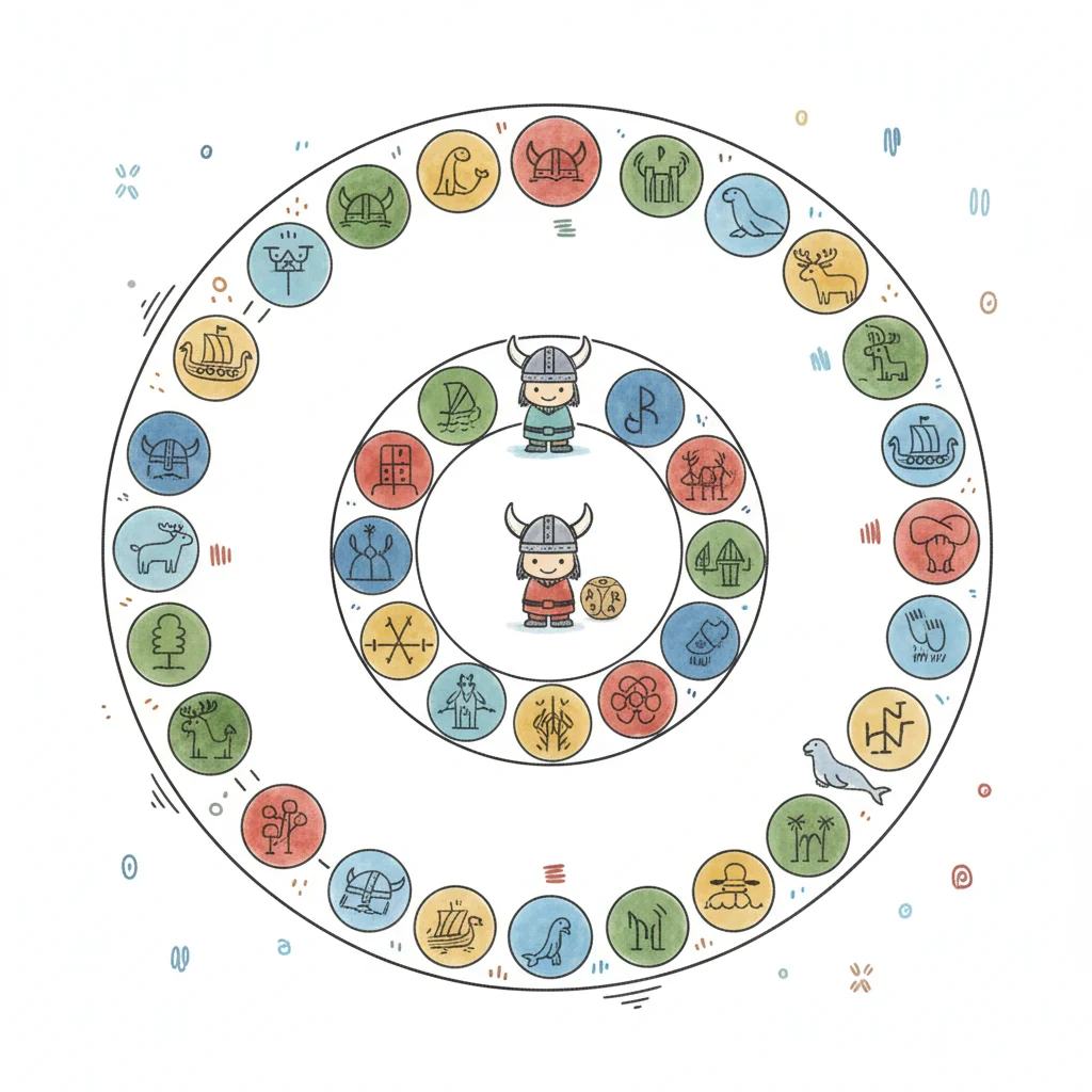 Cartoon-Wikinger umgeben von bunten Symbolen und Tieren in einer Spiralanordnung.