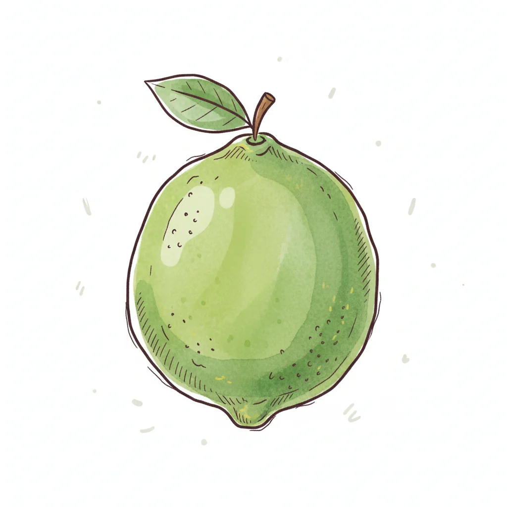 Eine handgezeichnete, grüne Limette mit Blatt und Stiel im Aquarellstil auf weißem Hintergrund.