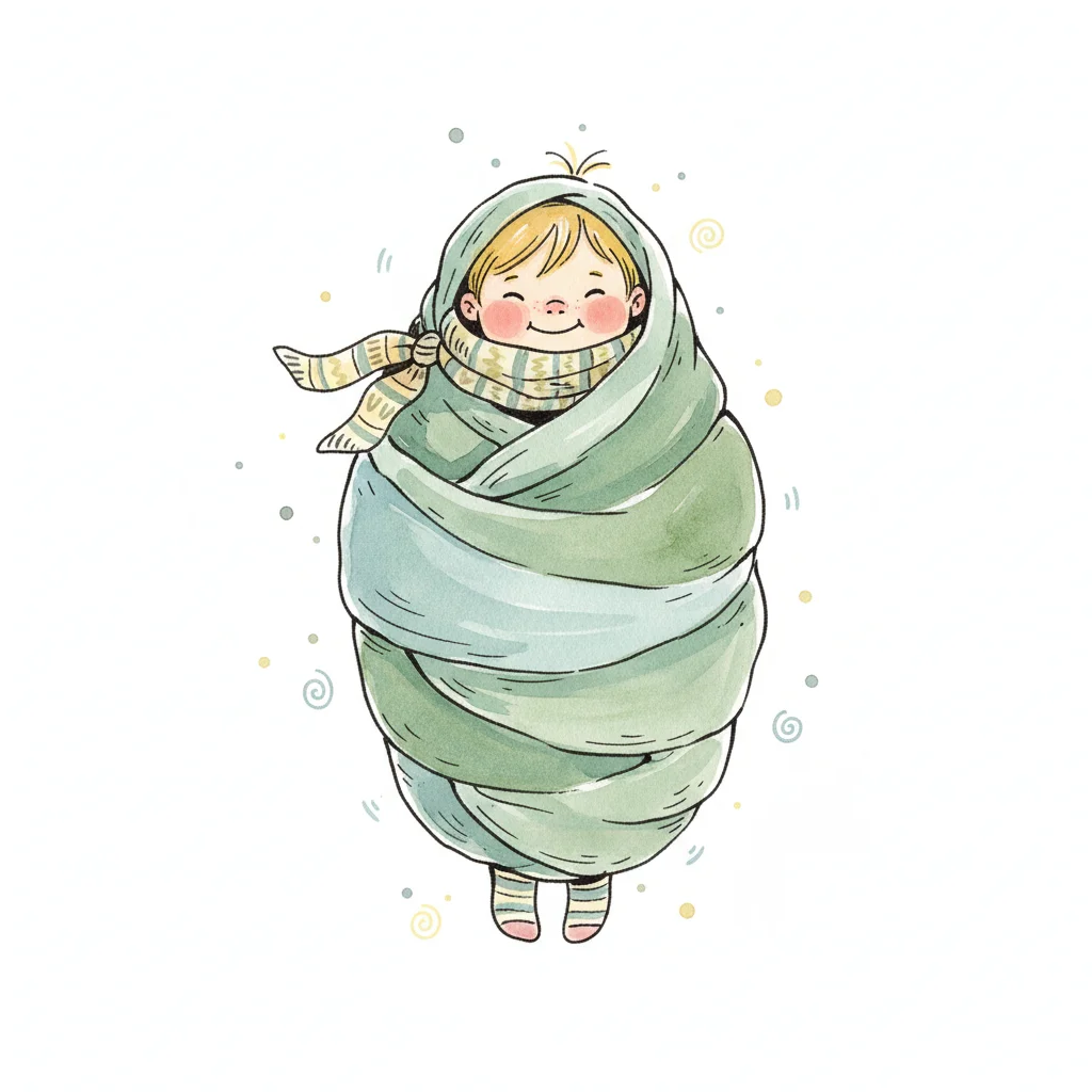 Niedliches, lächelndes Kind in Decke und Schal eingewickelt, im Aquarellstil.