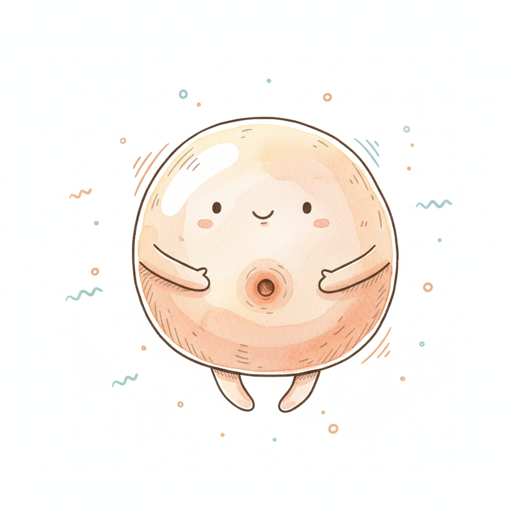 Ein niedlicher, runder Charakter mit einem Lächeln und kleinen Füßen.