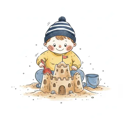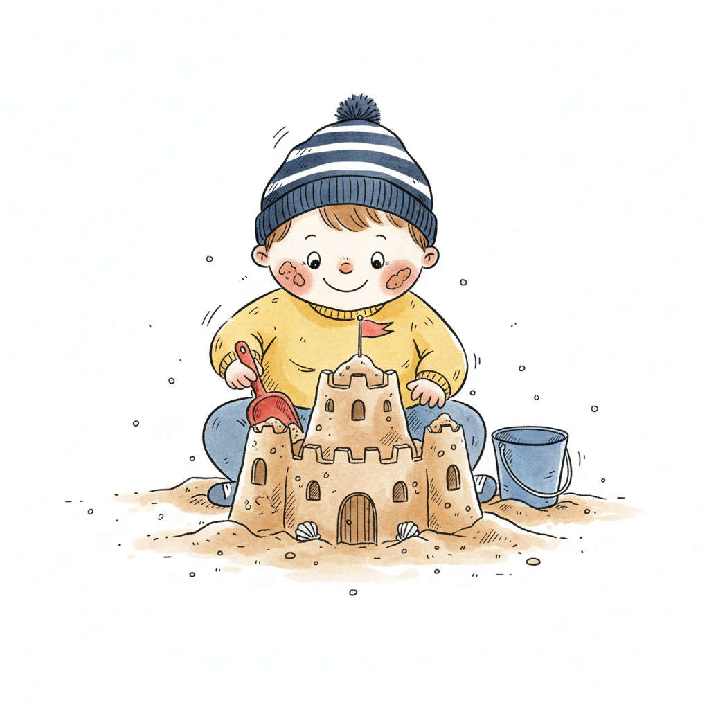Ein lächelndes Kind mit Mütze baut eine Sandburg am Strand mit Schaufel und Eimer.