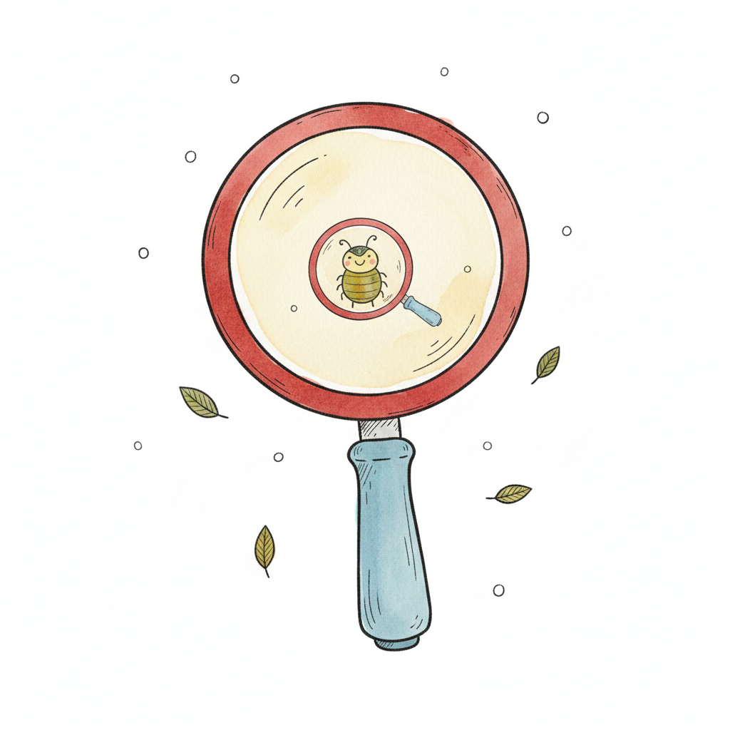 Eine Lupe vergrößert einen lächelnden Käfer, der wiederum durch eine kleinere Lupe betrachtet wird.
