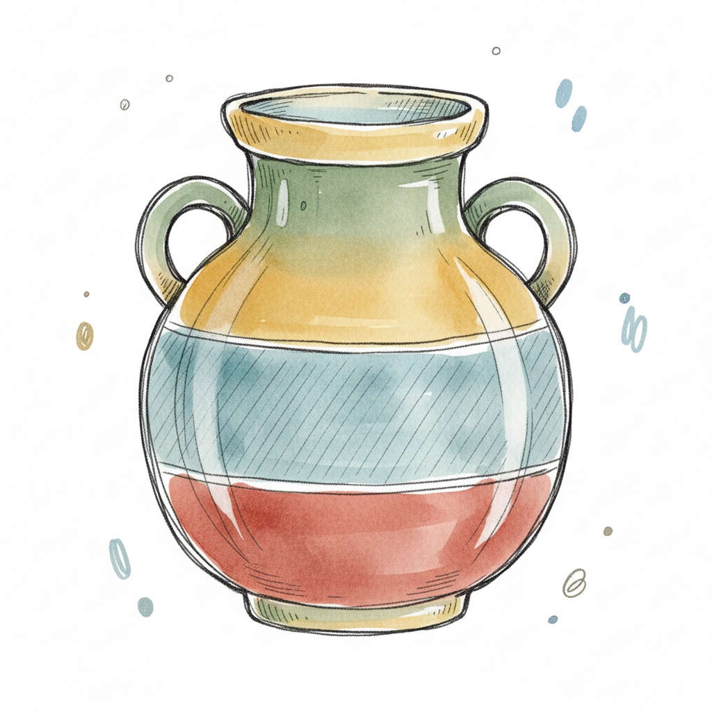 Bunte Aquarell-Vase mit Henkeln und gestreiften Abschnitten in Grün, Gelb, Blau, Rot.
