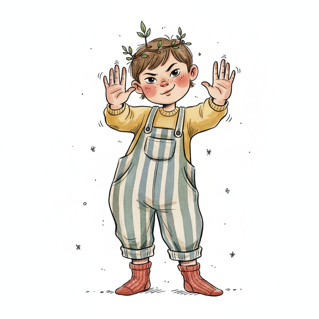 Niedliches Kind mit Blätterkranz und gestreifter Latzhose, Hände erhoben, spielerischer Ausdruck.