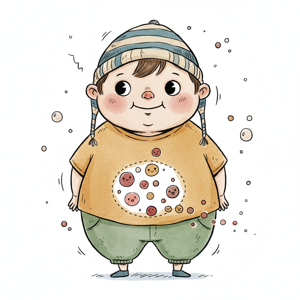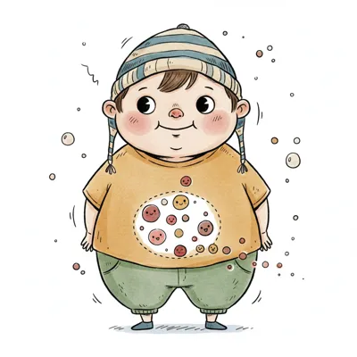 Niedliche, kindgerecht illustrierte Szene mit einem Kind oder einer Person als Hauptfigur, vor rein weißem Hintergrund, im frech-nordischen Aquarell-Skizzenstil. Klare, leicht wackelige Tuschekonturen, sichtbare Pinsel- und Strichtextur, dezente Schraffuren, weiche handgemalte Farbflächen in gedeckten Farben. Einfache, runde Formen. Keine harten Schatten, sondern sanfte, transparente Aquarellschichten. Leicht raue, handgezeichnete Linien statt glatter Vektorkanten. Subtile, vereinzelte Kritzelpunkte oder kleine Details im Hintergrund (wie Pünktchen oder feine Striche), aber keine echte Umgebung oder Landschaft. Die Figur ist mittig zentriert. Insgesamt charmant, humorvoll, warm und handgemacht wirkend. WICHTIG: Das Bild darf ABSOLUT KEINEN TEXT, KEINE BUCHSTABEN und KEINE ZAHLEN enthalten.