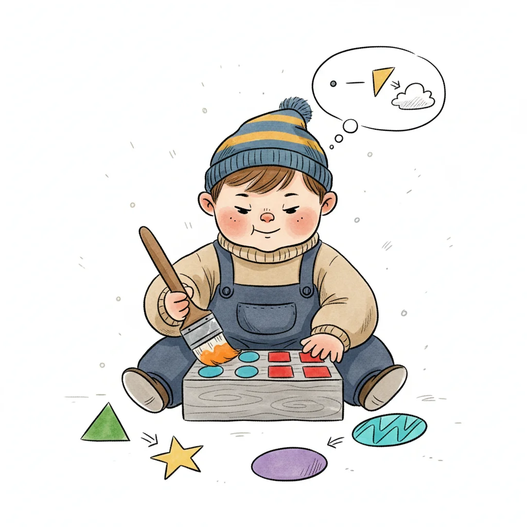 Cartoon-Baby in Mütze malt Formen auf Holzbrett, umgeben von bunten Figuren, mit kreativen Gedanken.