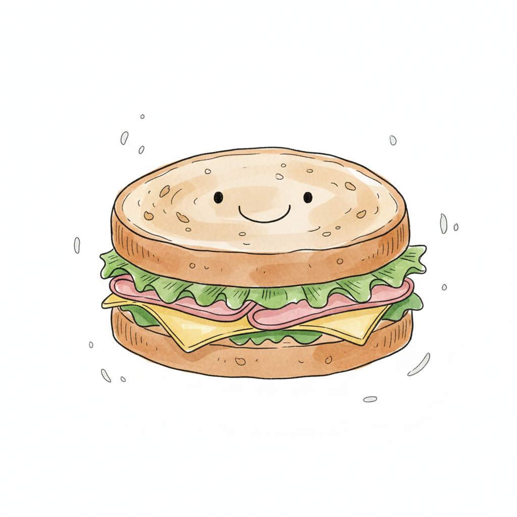 Ein süßes, lächelndes Sandwich mit Schinken, Käse und Salat in Aquarell-Optik.