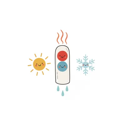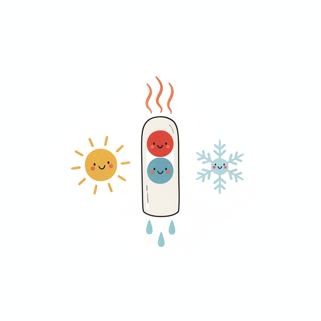 Niedliches Thermometer mit lächelnden Gesichtern, umgeben von Sonne, Hitze, Schneeflocke und Kälte.