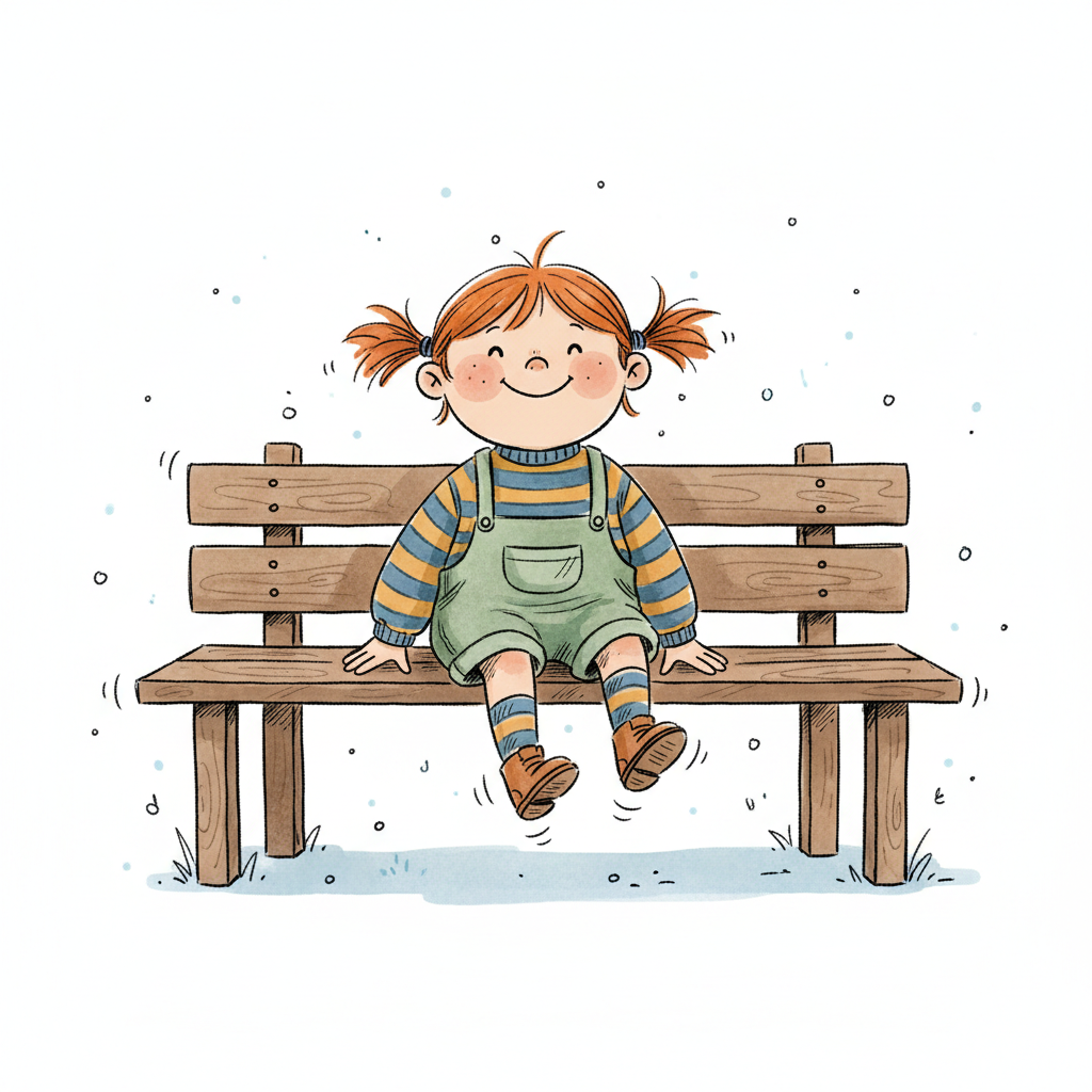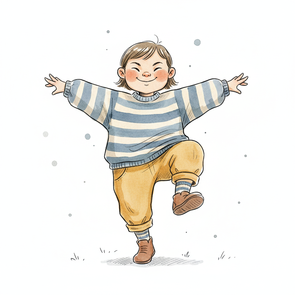 Niedliche, kindgerecht illustrierte Szene mit einem Kind oder einer Person als Hauptfigur, vor rein weißem Hintergrund, im frech-nordischen Aquarell-Skizzenstil. Klare, leicht wackelige Tuschekonturen, sichtbare Pinsel- und Strichtextur, dezente Schraffuren, weiche handgemalte Farbflächen in gedeckten Farben. Einfache, runde Formen. Keine harten Schatten, sondern sanfte, transparente Aquarellschichten. Leicht raue, handgezeichnete Linien statt glatter Vektorkanten. Subtile, vereinzelte Kritzelpunkte oder kleine Details im Hintergrund (wie Pünktchen oder feine Striche), aber keine echte Umgebung oder Landschaft. Die Figur ist mittig zentriert. Insgesamt charmant, humorvoll, warm und handgemacht wirkend. WICHTIG: Das Bild darf ABSOLUT KEINEN TEXT, KEINE BUCHSTABEN und KEINE ZAHLEN enthalten.