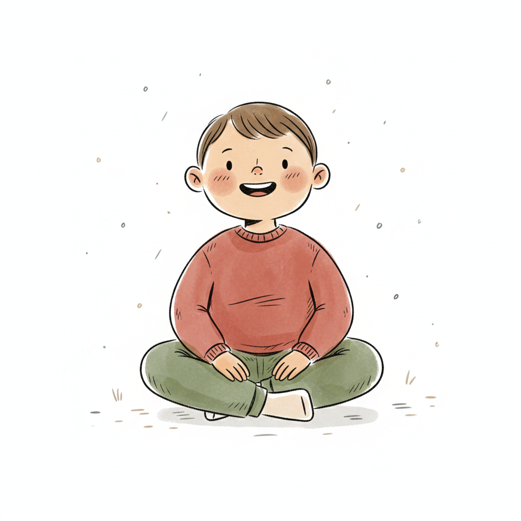 Ein lächelnder Junge sitzt fröhlich mit gekreuzten Beinen auf dem Boden.
