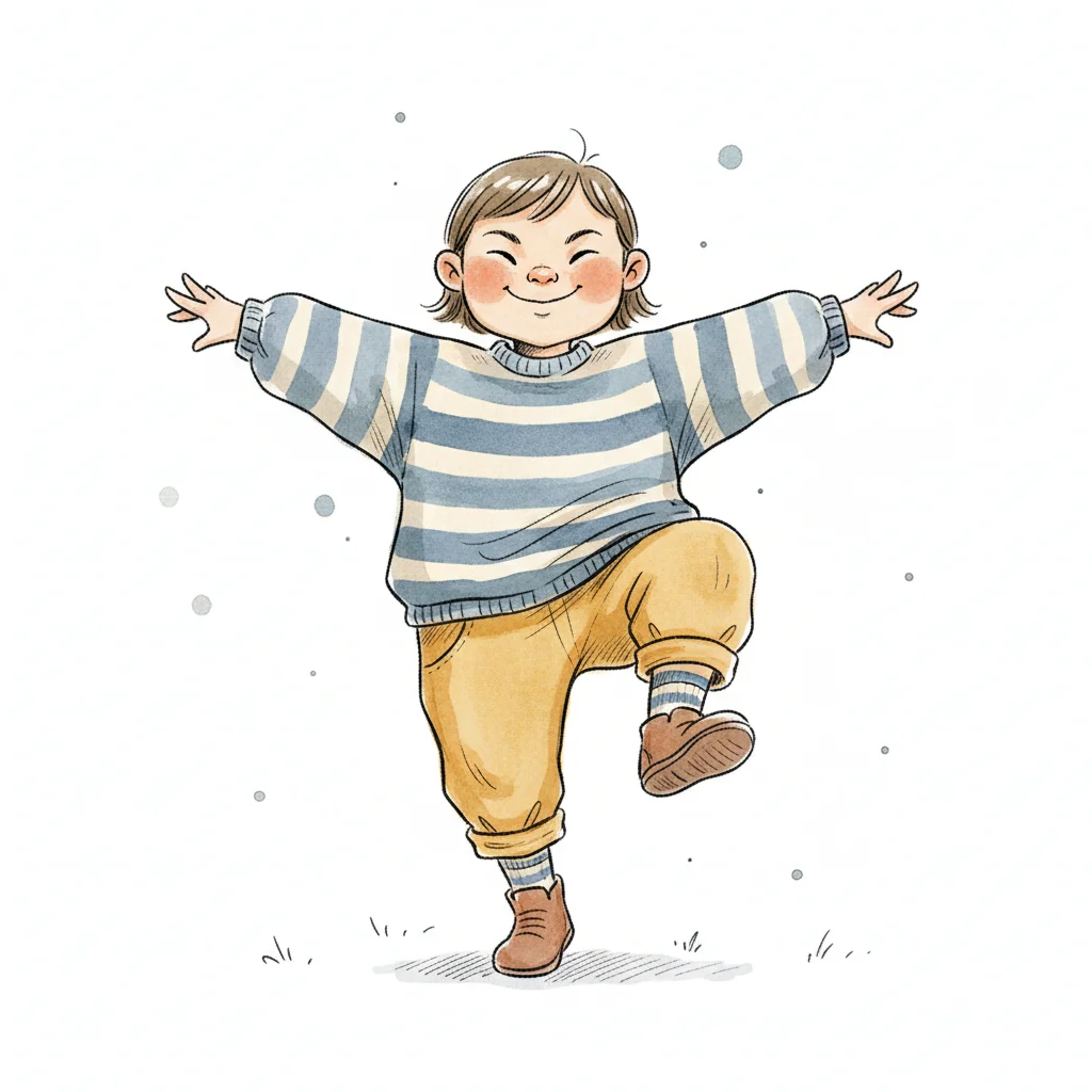 Ein fröhliches Kind tanzt mit einem breiten Lächeln.