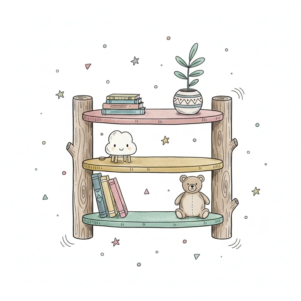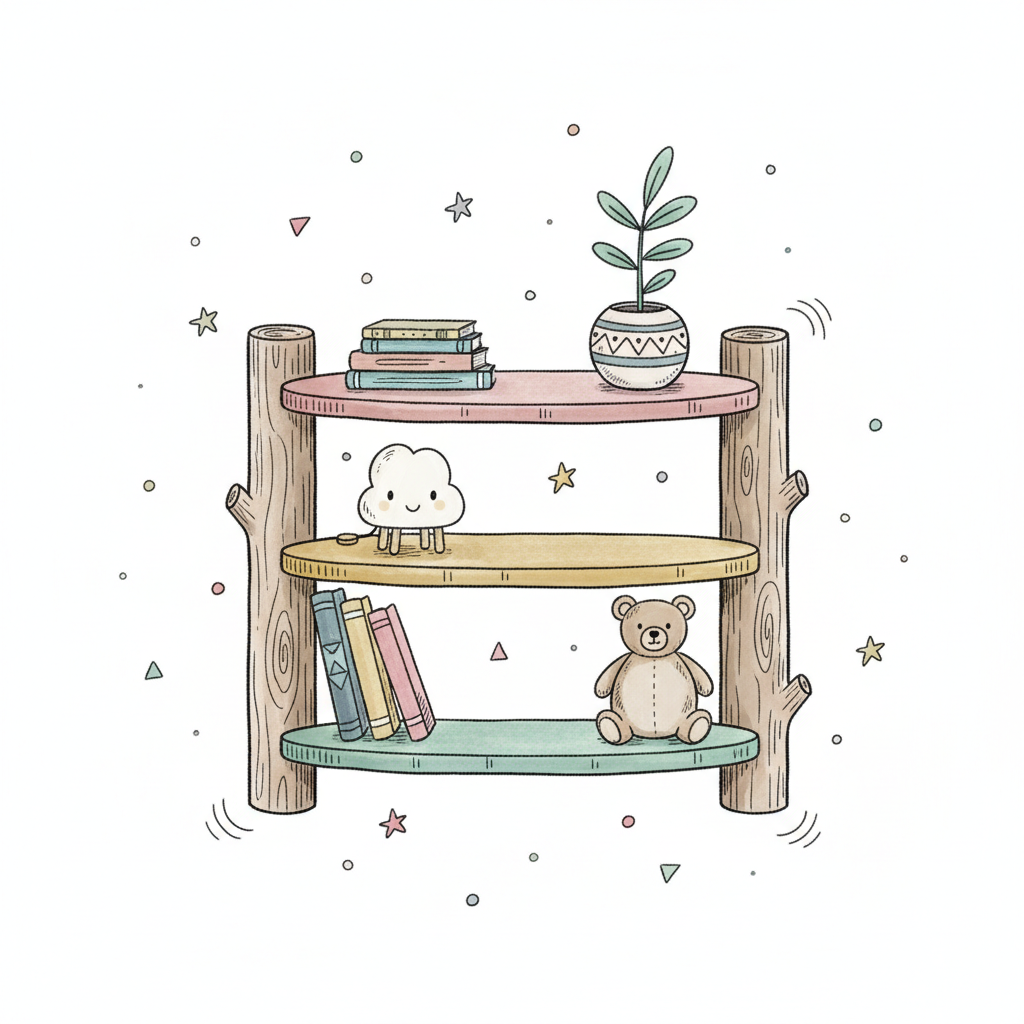 Niedliches Kinderzimmer-Regal mit Büchern, Pflanze, Wolke und Teddybär, umgeben von Sternen.