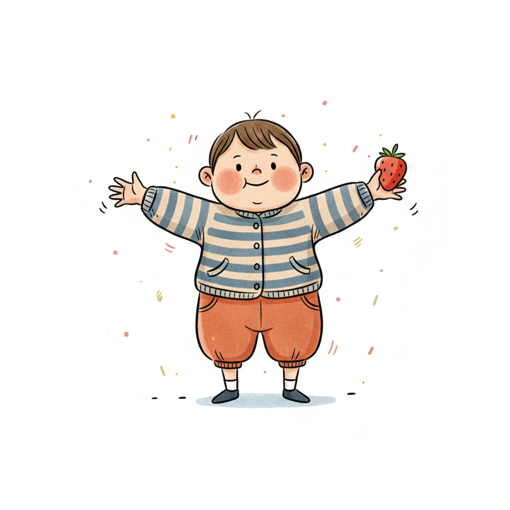 Fröhliches Cartoon-Kind mit gestreiftem Pullover hält eine Erdbeere und lächelt.