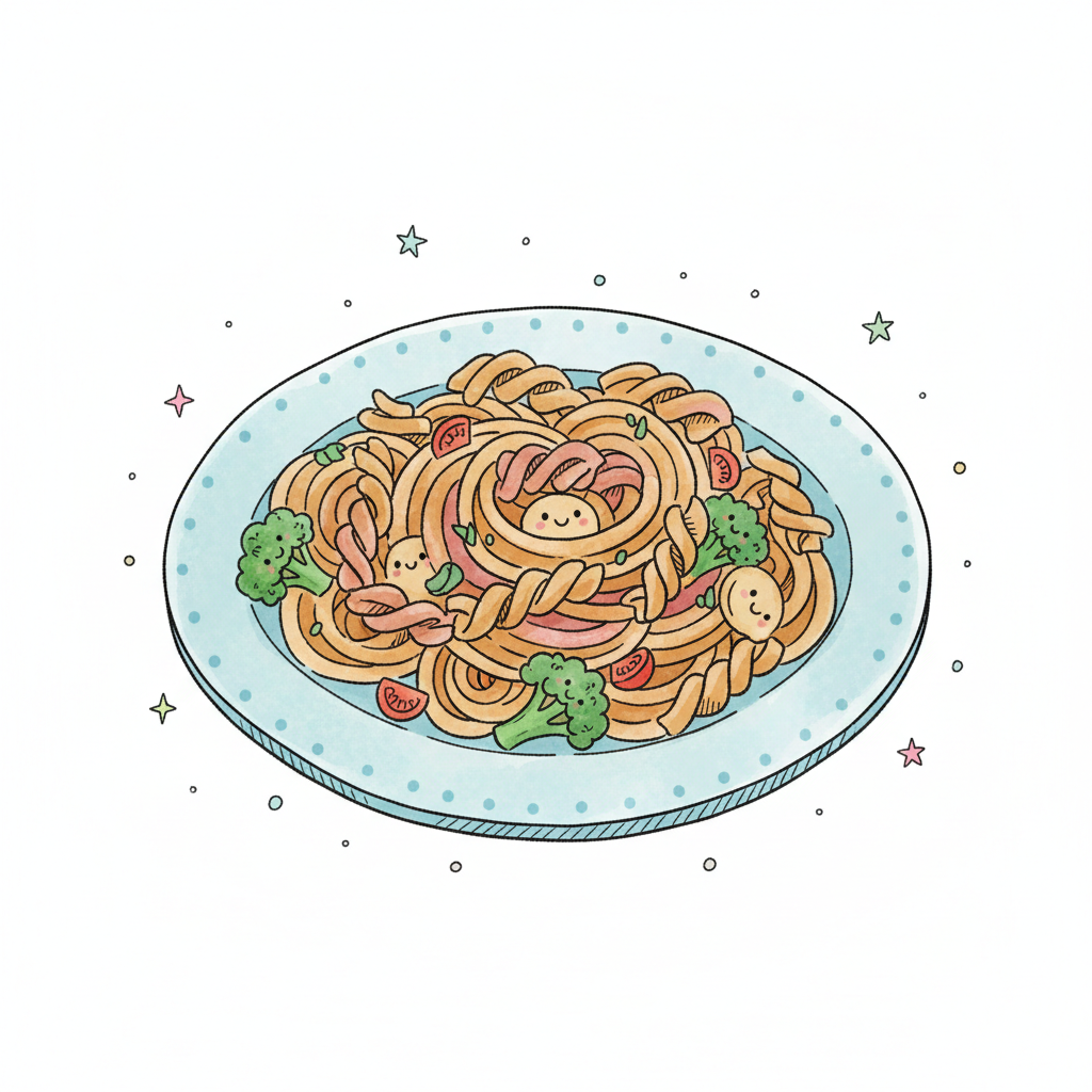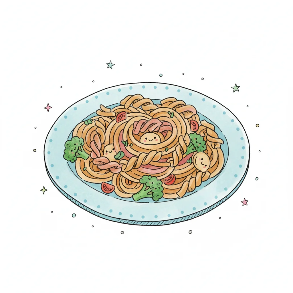 Niedliche Cartoon-Pasta mit lächelnden Gesichtern, Brokkoli, Tomaten und Schinken auf blauem Teller.