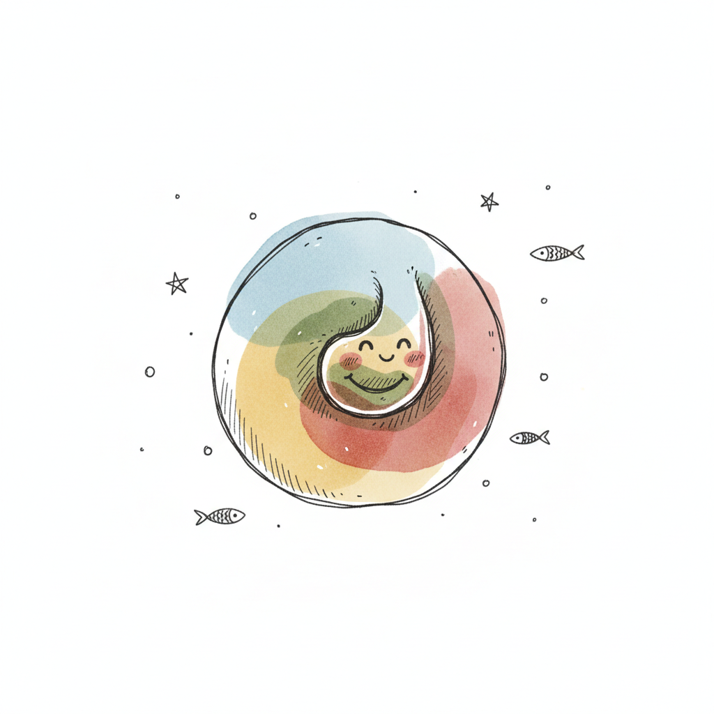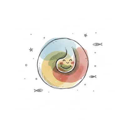 Buntes, lächelndes Spiralobjekt mit Aquarellfarben, umgeben von Fischen und Sternen.