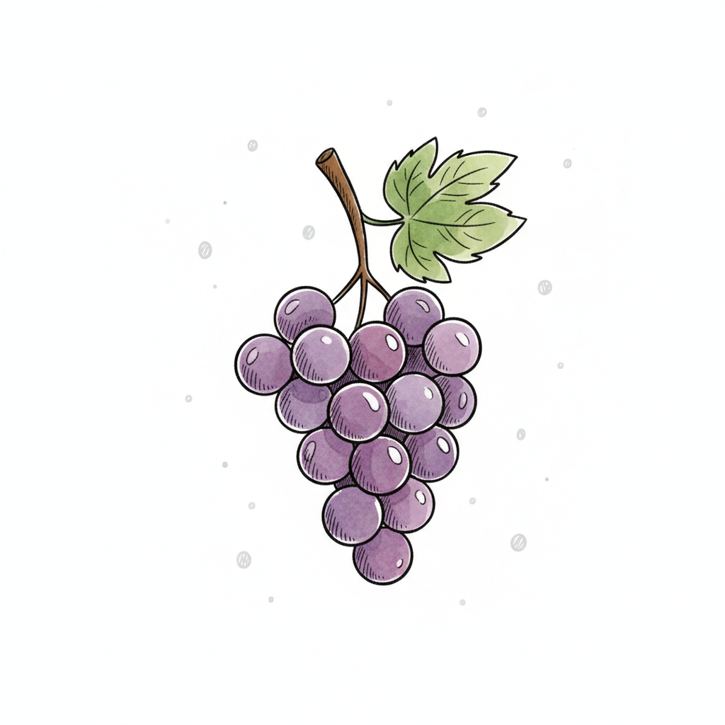 Aquarell-Illustration einer lila Traube mit grünem Blatt und Stiel auf weißem Hintergrund.