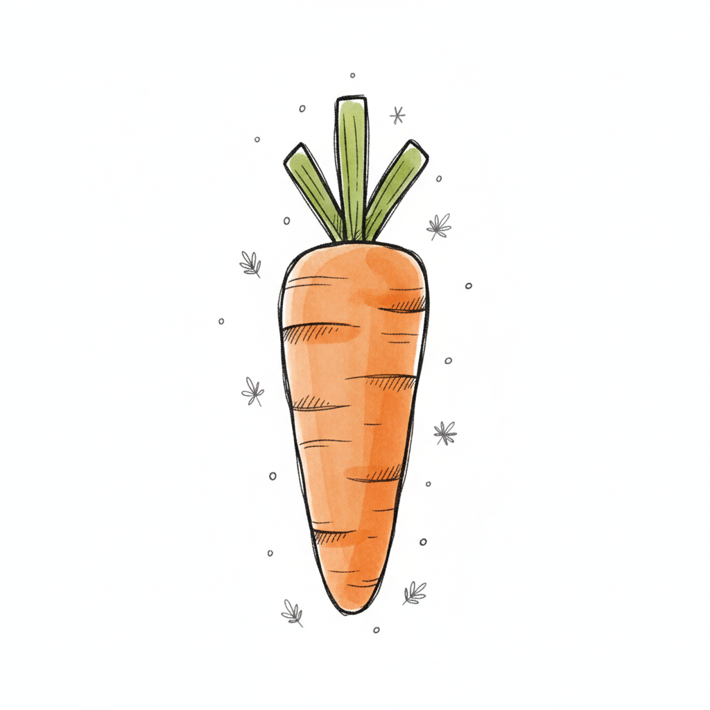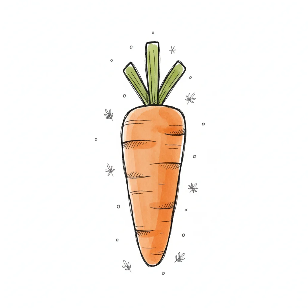 Eine handgezeichnete Karotte in Aquarell-Optik mit grünen Blättern auf weißem Hintergrund.