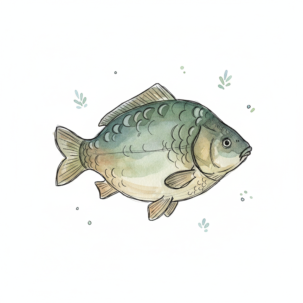 Aquarellzeichnung eines Karpfens mit grünen Schuppen und feinen Details auf weißem Hintergrund.