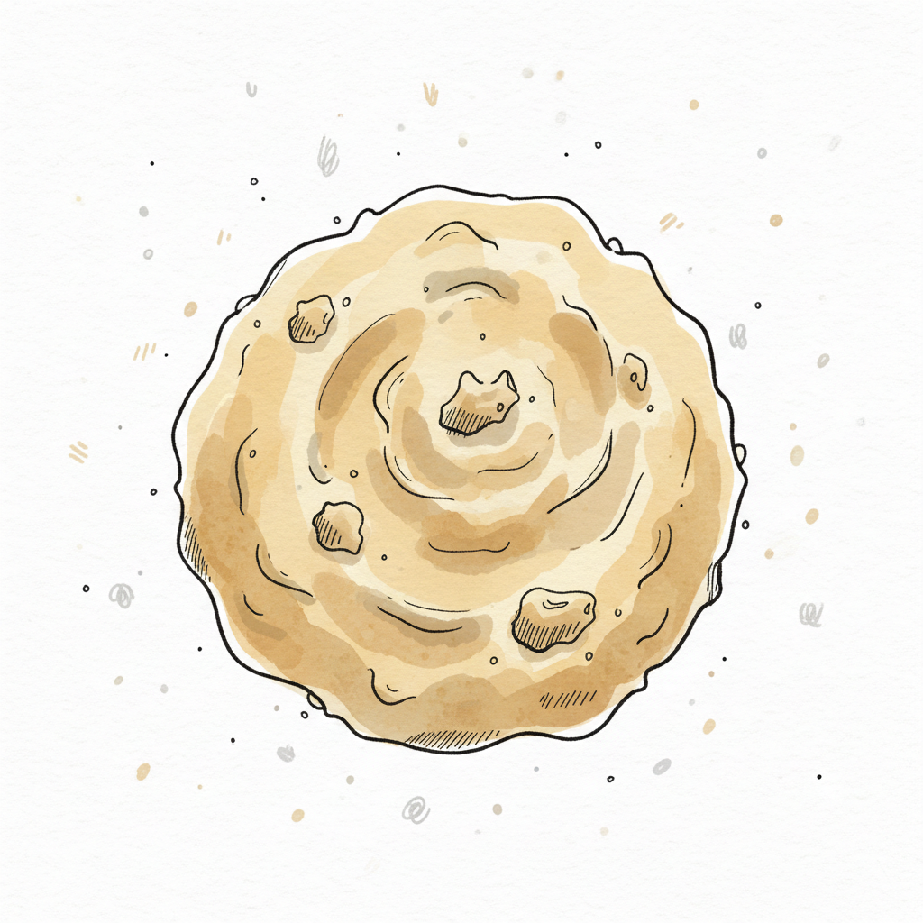 Handgezeichneter Keks mit Schokostückchen in Aquarell-Optik auf weißem Hintergrund.