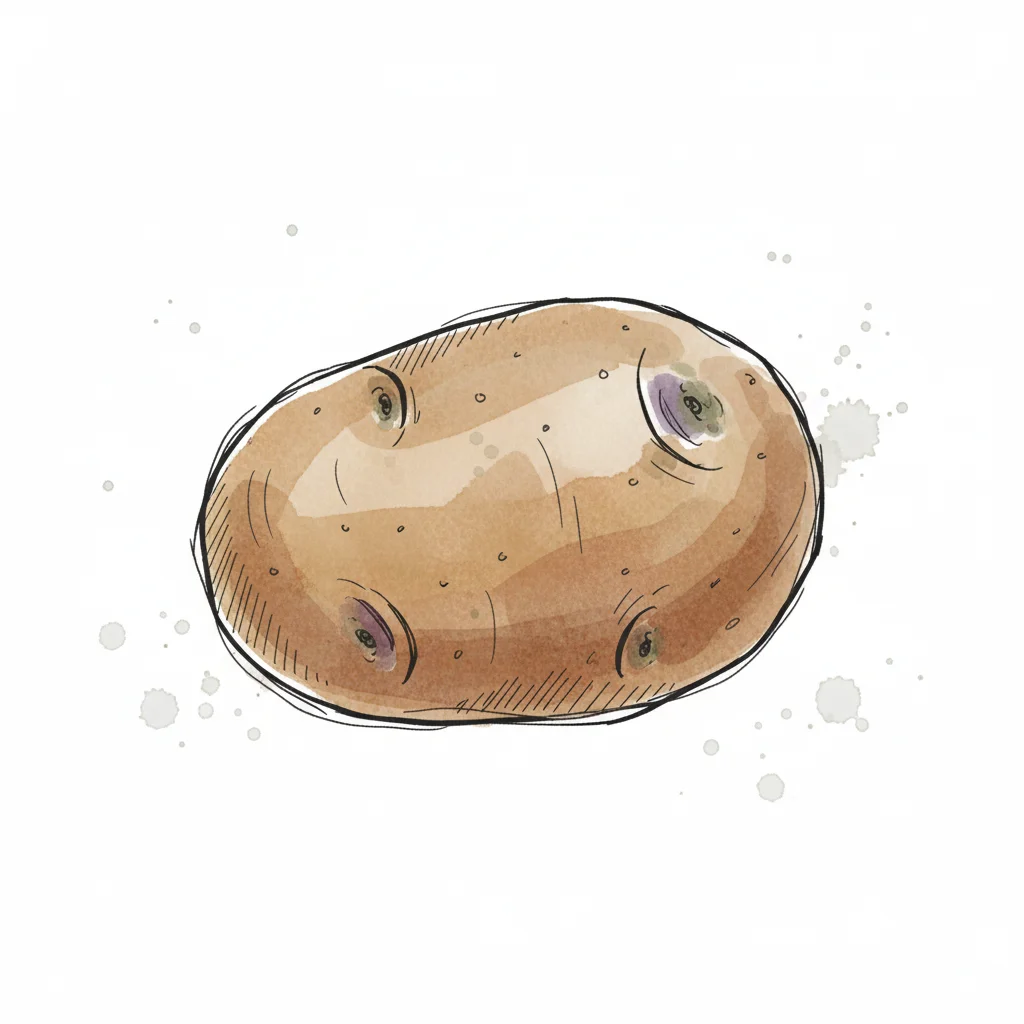 Aquarell-Illustration einer Kartoffel auf weißem Hintergrund mit Farbspritzern.