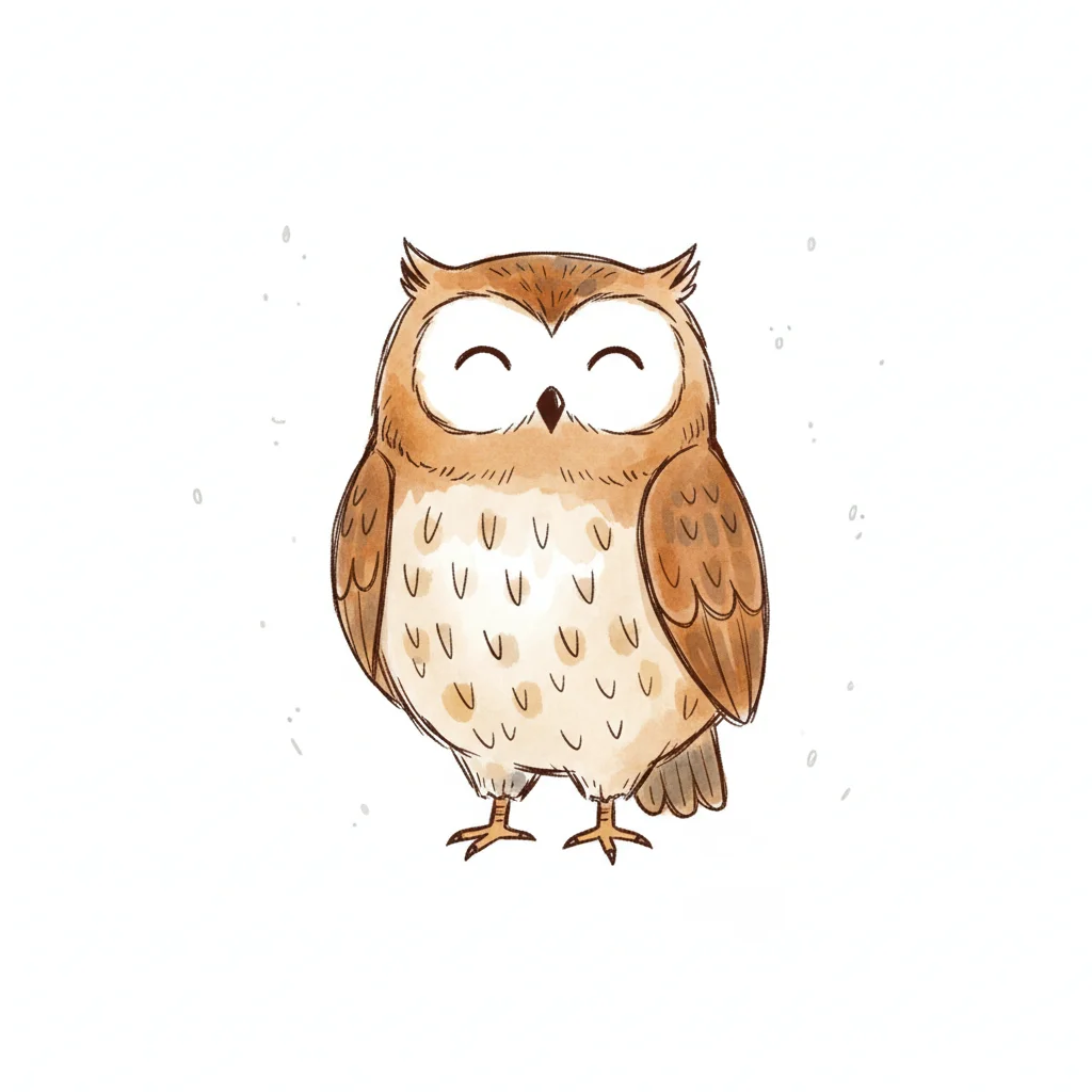 Niedliche, lächelnde Eule in Aquarell-Optik auf weißem Hintergrund.