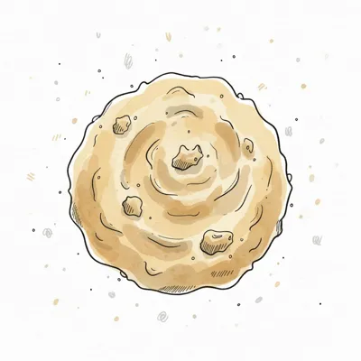 Handgezeichneter Schokoladenkeks mit dunklen Schokostückchen und kleinen Krümeln auf weißem Grund.