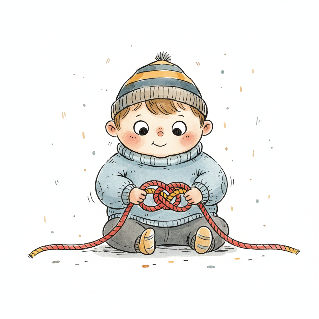 Niedliches Cartoon-Kind in Mütze und Pullover, das einen Seilknoten hält und lächelt.