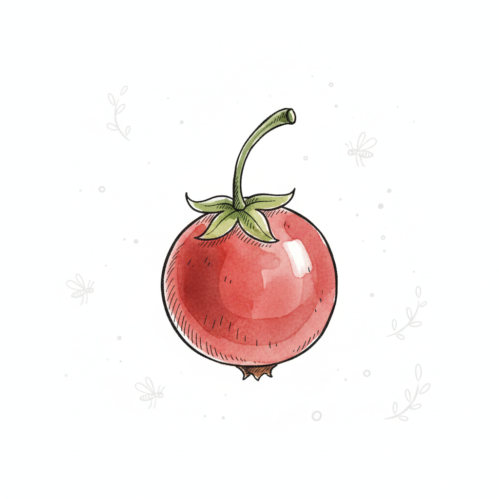 Aquarell-Illustration einer roten Frucht mit grünem Stiel und Blättern auf weißem Hintergrund.