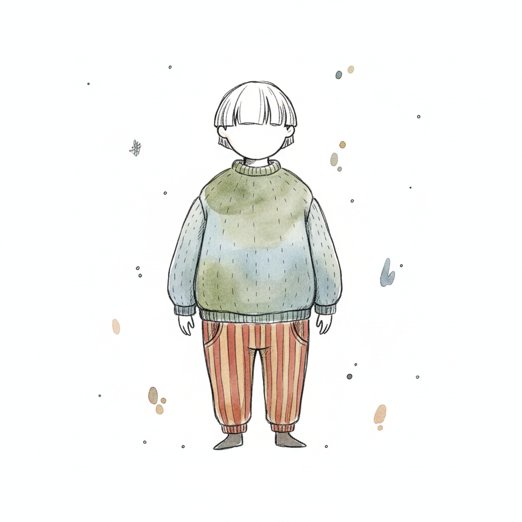 Niedliche Aquarellfigur mit Topfschnitt, gestreifter Hose und Pulli auf weißem Grund.