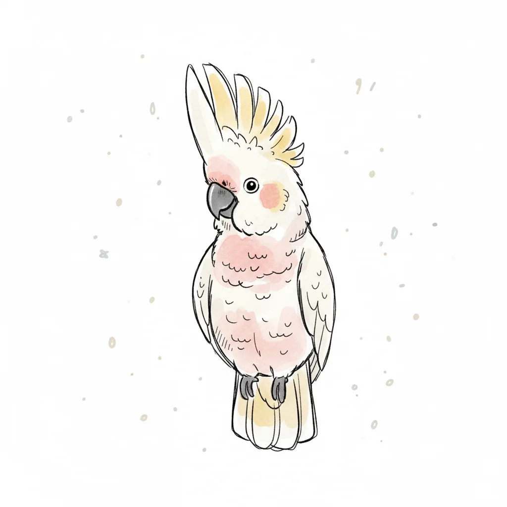 Niedliche Aquarell-Illustration eines Kakadus mit rosa Wangen und gelbem Schopf auf weißem Hintergrund.